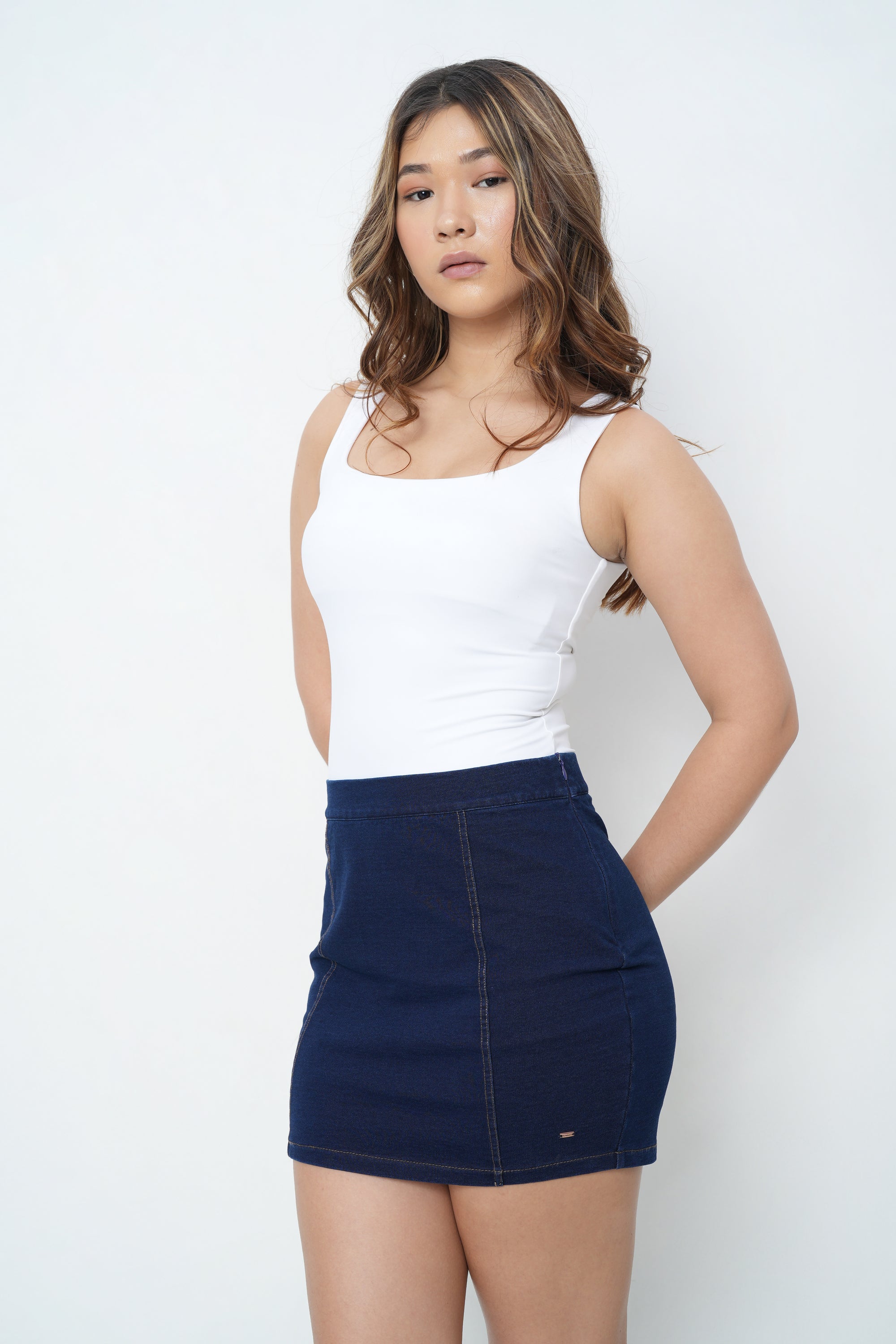 Knitted denim fitted skirt contrast stitch and clean wash.