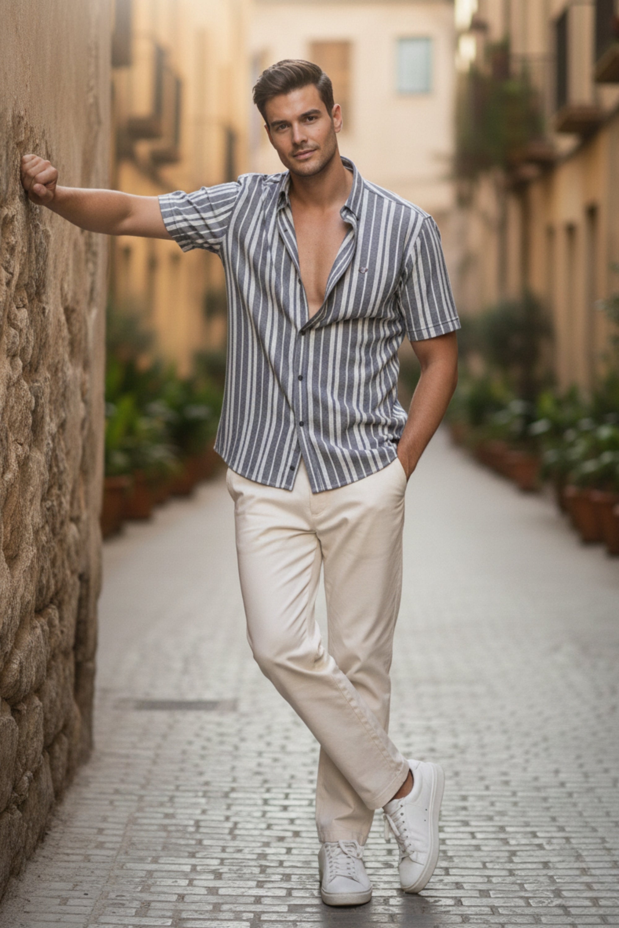 Cement & White Regular Fit Vertical Striped Shirt